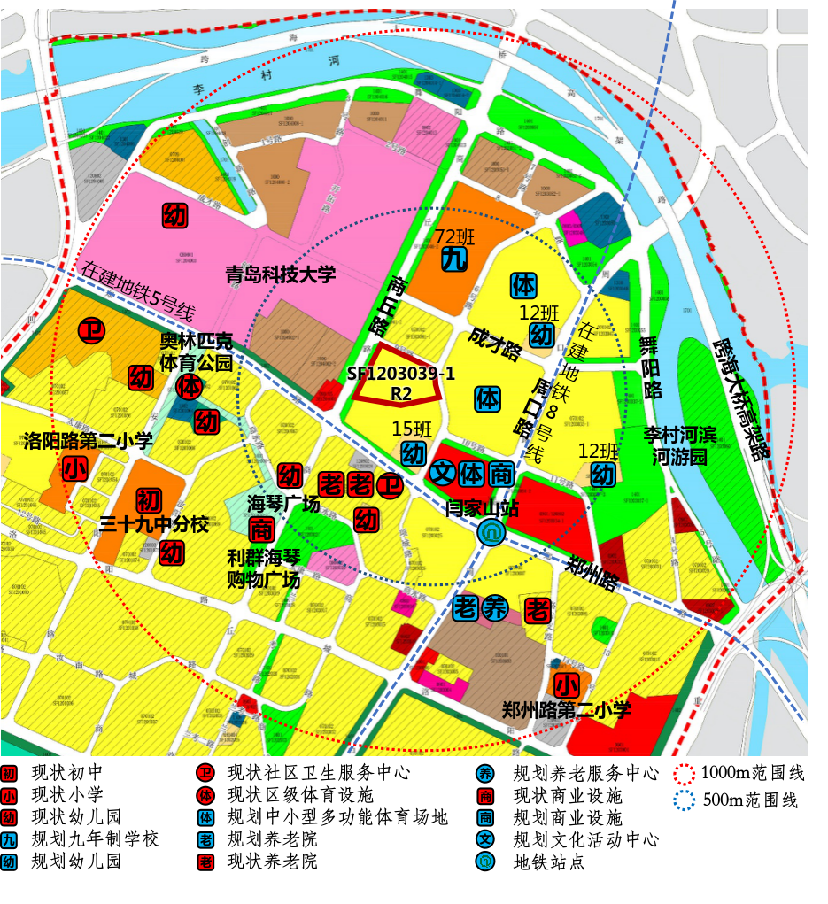 2.教育与医疗:现状周边有青岛科技大学、三十九中市北分校、郑州路第二小学、洛阳路第二小学、现状幼儿园6处、社区卫生服务中心2处,规划周边有九年制学校1处、幼儿园3处;