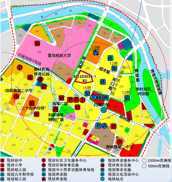 2.教育与医疗:现状周边有青岛科技大学、三十九中市北分校、郑州路第二小学、洛阳路第二小学、现状幼儿园6处、社区卫生服务中心2处,规划周边有九年制学校1处、幼儿园3处;