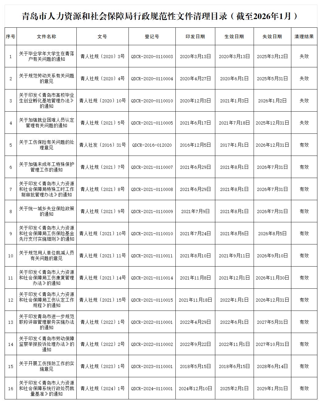 正规十大网赌网站人力资源和社会保障局行政规范性文件清理目录(截至2026年1月)_青岛政务网