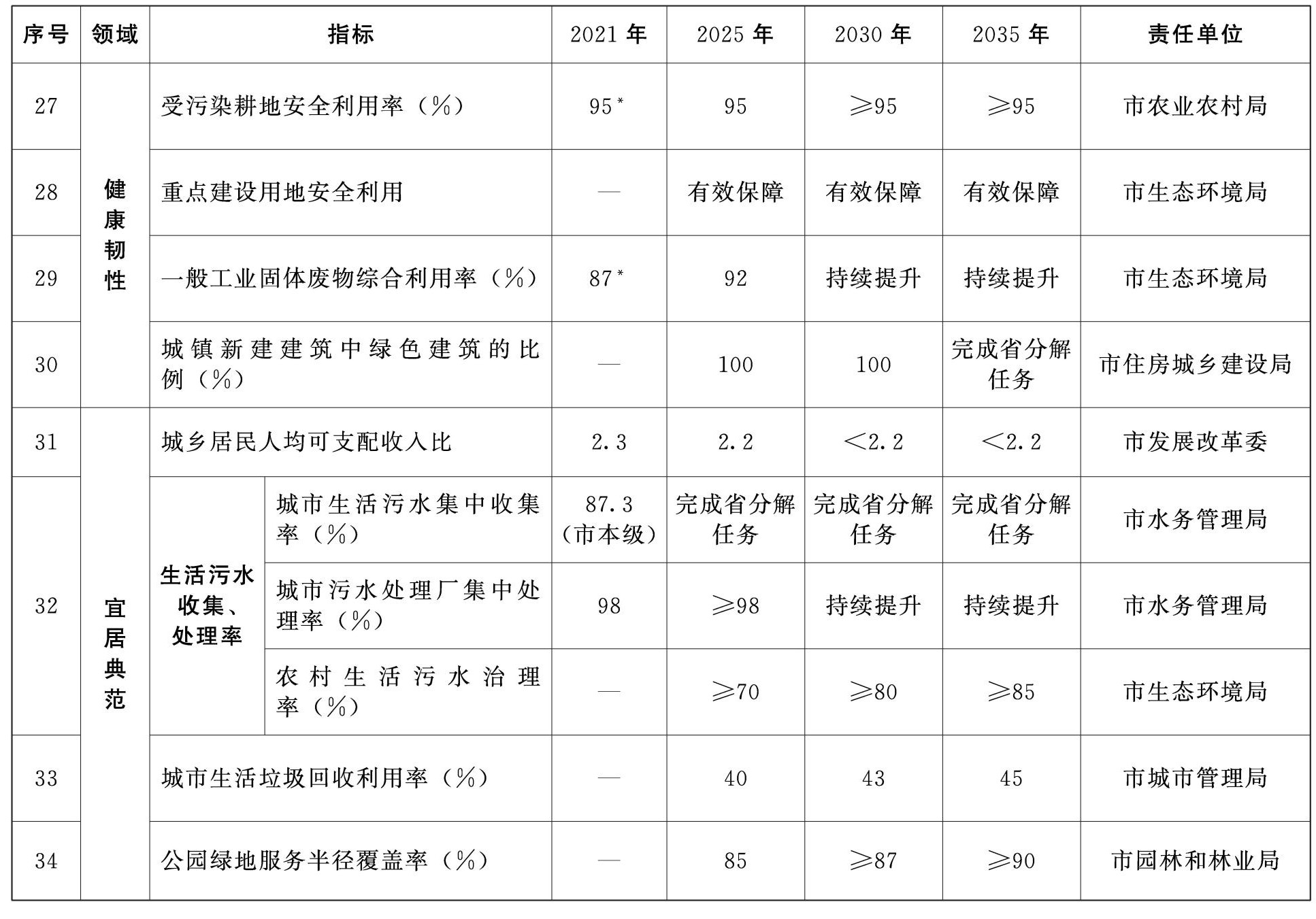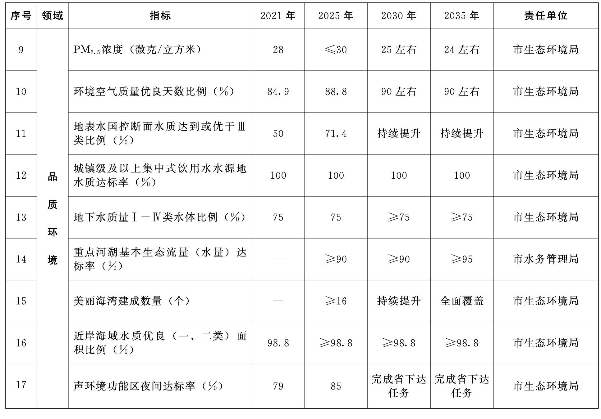 (2)生态环境保护成效持续提升。城市生态环境质量持续提升,主要污染物排放总量持续下降,生态系统和生物多样性得到有效保护,生态安全得到有效保障,一流生态基底更加稳固。重污染天气基本消除,地表水国控断面水质优良(达到或优于Ⅲ类)比例达到71.4%,城乡黑臭水体基本消除。近岸海域水质优良(一、二类)面积比例保持98.8%以上。生态质量指数(EQI)稳中向好,土壤安全利用水平巩固提升。