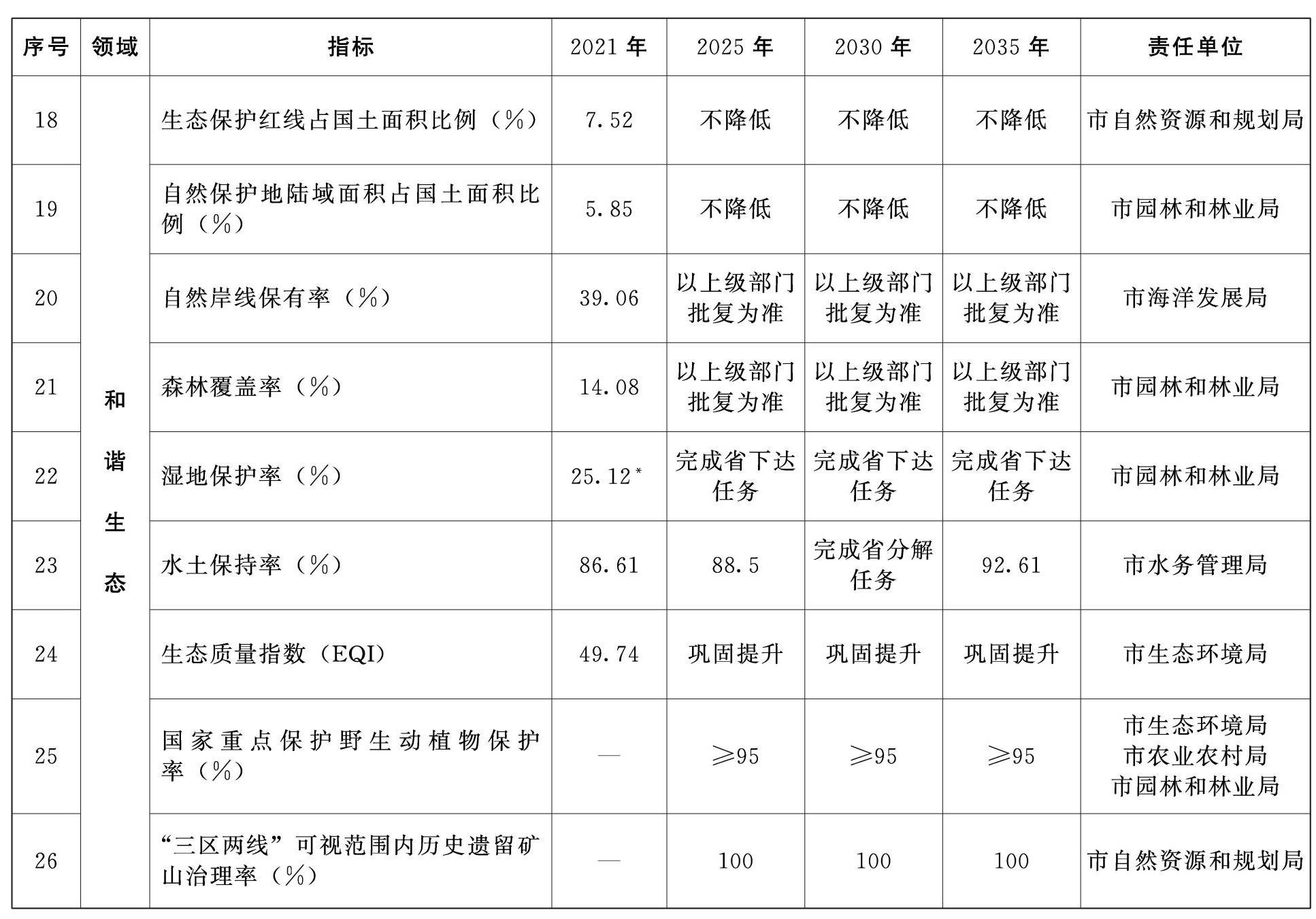(1)绿色经济高质量发展水平持续提升。国土空间保护格局得到优化,绿色低碳发展深入推进,蓝色经济和绿色经济新动能加速释放,“绿水青山就是金山银山”转化通道创新拓展。高新技术产业产值占规模以上工业总产值比重达到65%左右,海洋战略性新兴产业年均增速达到8%左右。
