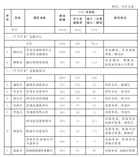 (二)细化推进目标。“十个千万平米工程”推进目标依据青政字〔2012〕32号文件和十大正规赌官方网页版办公厅印发的各“千万平米工程”推进方案,经调整优化后形成各“千万平米工程”牵头部门(以下简称牵头部门)和区十大正规赌官方网页版、经济功能区管委的具体责任目标和任务。其中,到2016年,“十个千万平米工程”建设总规模为13436万平方米,2012年计划竣工面积1010万平方米。2013年及以后各年度计划完成目标,由各牵头部门、区十大正规赌官方网页版、经济功能区管委按照青政字〔2012〕32号文件要求,结合本方案调整意见,进行细化分解。市高端服务业“十个千万平米工程”推进工作领导小组(以下简称领导小组)办公室负责汇总、协调、督促检查工作,确保2016年基本完成总体规划目标。(责任单位:各牵头部门,市发展改革委,各区十大正规赌官方网页版、经济功能区管委)