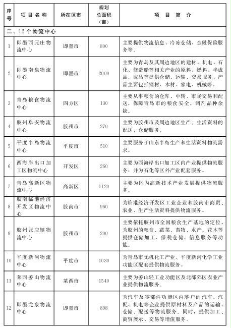 以“千万平米”物流园区为重点,规划建设物流园区、物流中心、专业配送中心支撑体系。依托交通运输枢纽、工业产业功能区、城乡市场,规划建设以布局集中、用地节约、产业集聚、功能集成、经营集约为特征的8大物流园区。重点规划推进包括西海岸物流产业园区、青岛胶州湾国际物流园、城阳综合物流园在内的“千万平米”物流园区建设。西海岸物流产业园区,包括前湾港南港区物流园、董家口港区物流园2个园区。前湾港南港区物流园,规划面积3.2平方公里,依托前湾保税港区,建设南港区物联物流示范园区和汽车滚装码头及汽车交易中心,打造大宗商品交易中心。董家口港区物流园,一期规划面积10平方公里,包括大宗散货物流园区和综合物流区,建设董家口港区大宗货物交易集散中心、国际水产品交易中心和冷链物流基地以及矿石、石化、煤炭等大宗商品三大交易平台等。胶州湾国际物流园,规划面积6平方公里,建筑面积600万平方米,以中铁联集青岛集装箱中心站为核心,打造以“公铁联运、海铁联运”为依托的大型物流枢纽,着力构筑山东半岛重要的陆路口岸。城阳综合物流园,规划面积5.3平方公里,在产业服务上与空港物流园区形成功能匹配,主要建设综合物流区和综合配套服务区。