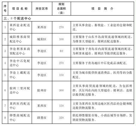 加快发展胶南临港经济开发区物流中心、胶州张应镇农产品物流中心、平度新河物流中心、莱西姜山物流中心等12个物流中心。鼓励支持李沧上臧配送中心、胶州三里河配送中心、莱西医药配送中心等8个配送中心建设。形成布局合理和功能完善的物流设施群,支撑三大物流体系建设,进一步提升物流业集聚化发展水平。