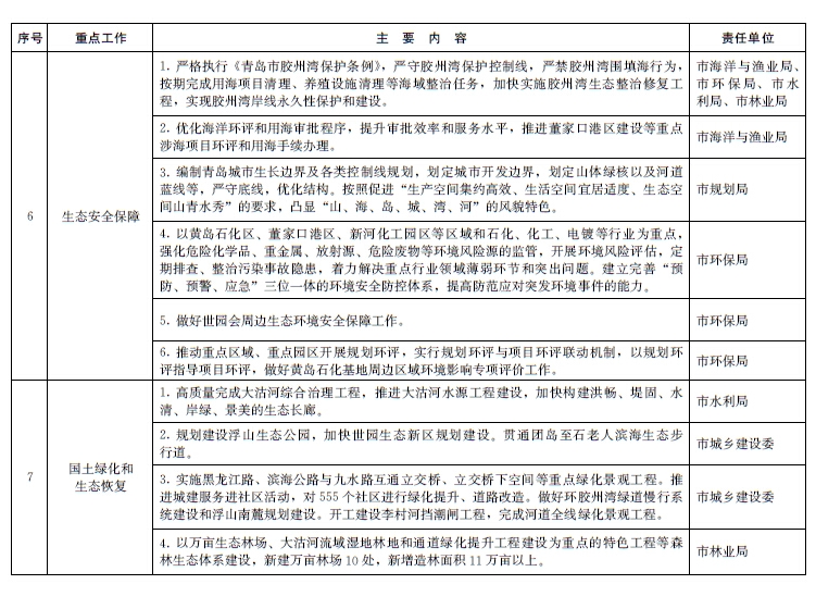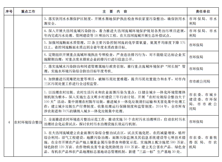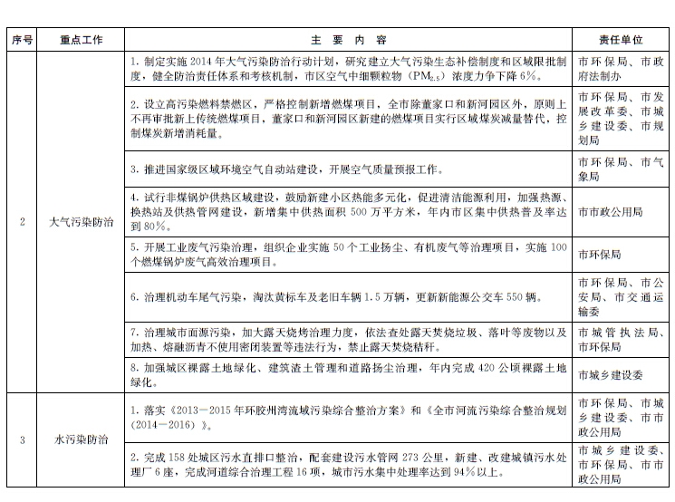 1.加快重点流域海域污染防治。根据《网上十大正规赌网址办公厅关于印发2013-2015年环胶州湾流域污染综合整治方案的通知》(青政办发〔2013〕4号)和《网上十大正规赌网址办公厅关于印发正规十大网赌网站河流污染综合治理规划(2014-2016年)的通知》(青政办发〔2013〕44号),全面开展全市河流污染整治,深化河道综合整治及生态修复工作,加快污水处理厂及配套管网建设,彻底解决城区污水直排等环境问题。到2016年,全市范围内主要河流水质明显改善,鱼类可稳定生长,胶州湾污染隐患基本消除。