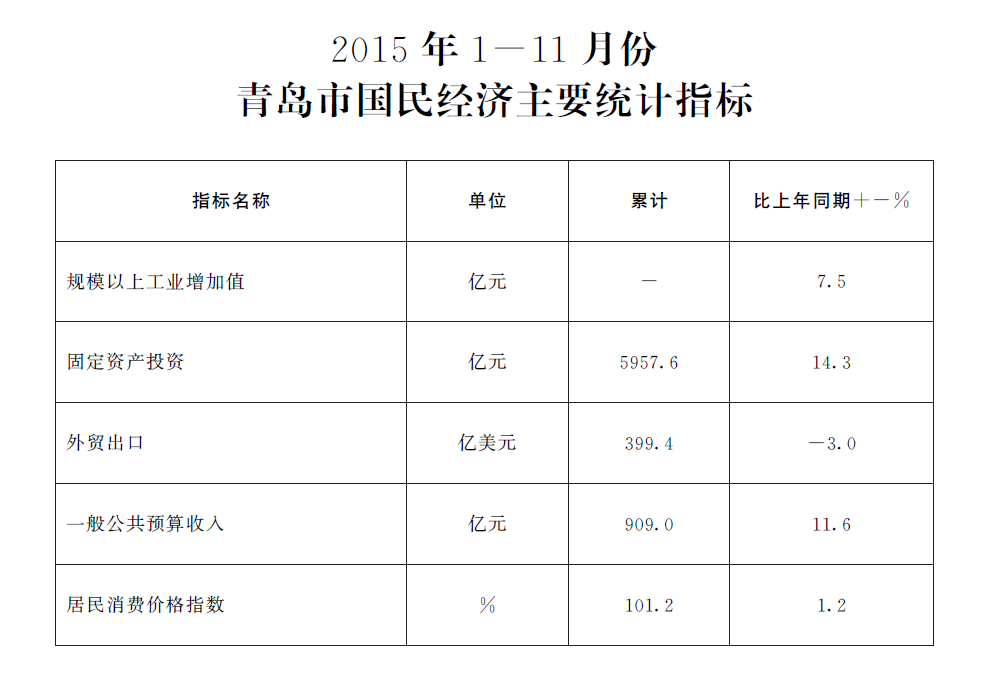 2015年1-11月份十大正规赌官方网页版国民经济主要统计指标_青岛政务网