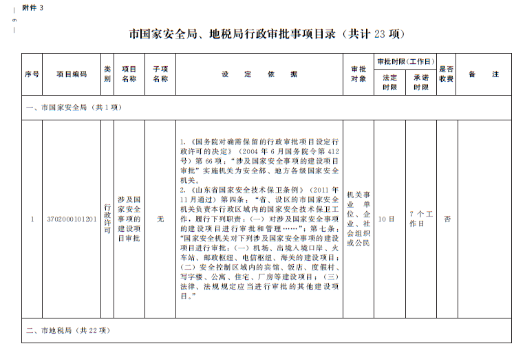 二、根据鲁审改〔2015〕3号文件,结合我市实际情况,公布市国家安全局、市地税局行政审批事项目录(详见附件3)。