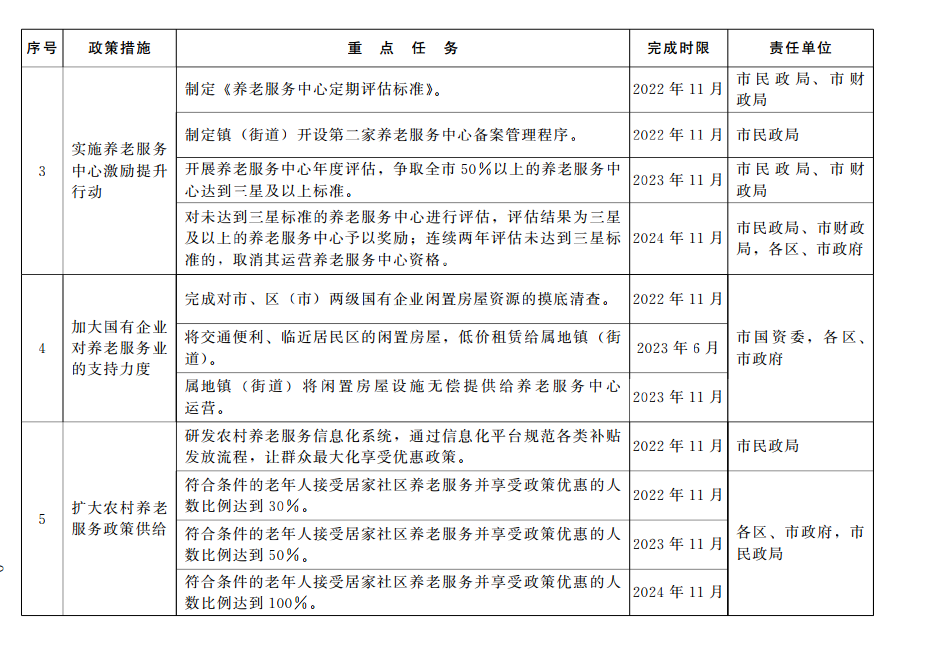 1.完善镇(街道)居家社区养老服务中心。采取新建、改扩建、利用闲置设施等方式,对镇(街道)居家社区养老服务中心(以下简称养老服务中心)进行提升,进一步扩大面积,增加服务功能。力争2024年年底前,全市养老服务中心服务面积达到1000平方米以上,具备助餐、助浴、助医、助洁、助乐、全托、日托、康复辅具租赁等服务功能。