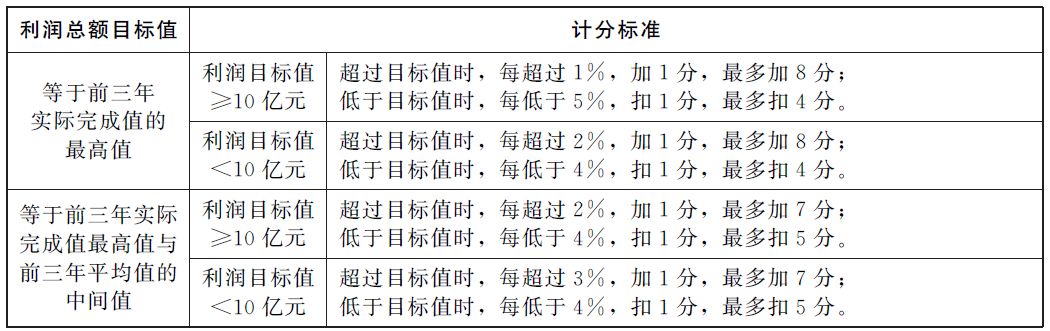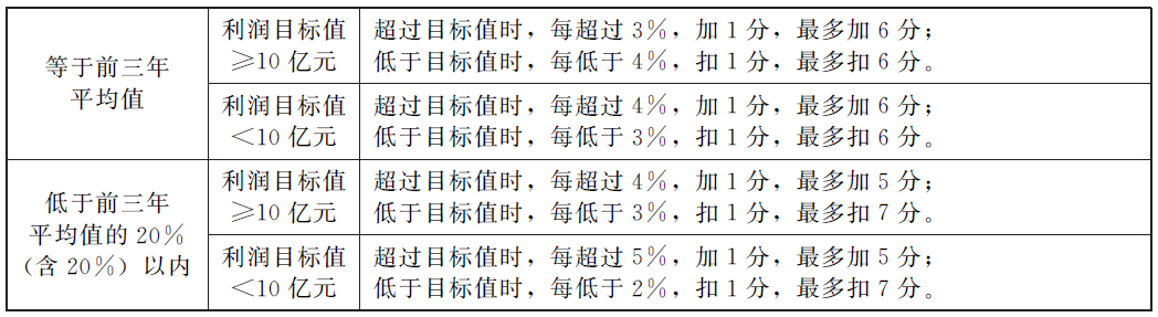 利润总额指标的基本分为30分。企业完成目标值时,得基本分30分。超过(低于)目标值时,按以下标准计分: