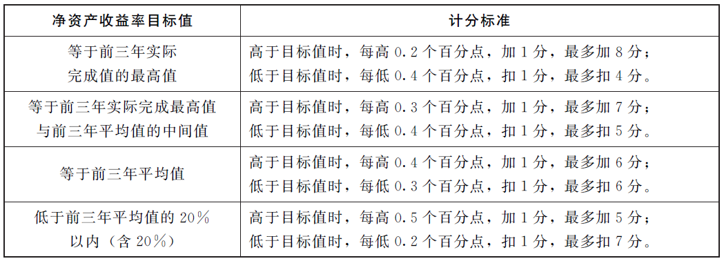 净资产收益率指标的基本分为30分。企业完成目标值时,得基本分30分。超过(低于)目标值时,按以下标准计分: