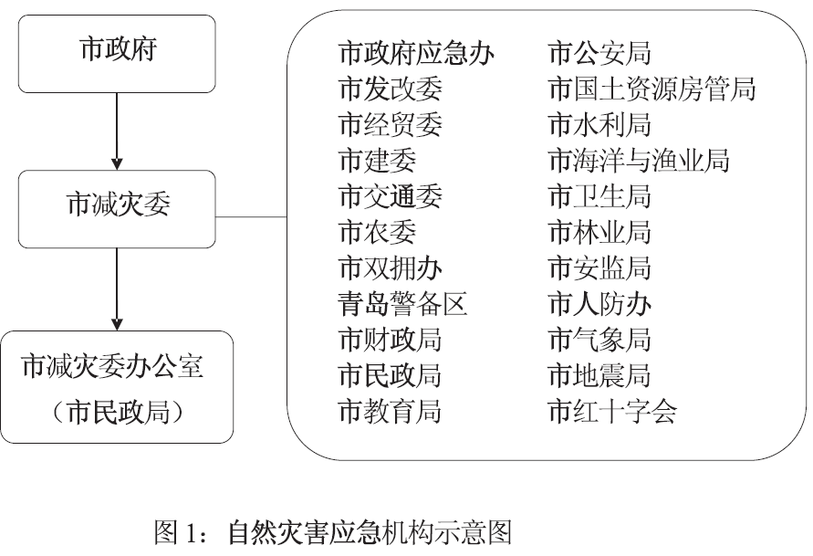 市减灾委员会(以下简称市减灾委)负责全市自然灾害救助应急综合协调,协调开展灾害应急响应、紧急救援、灾民安置、灾民生活安排及灾后恢复重建等工作。各主要成员单位共22个(应急机构如图1所示)。