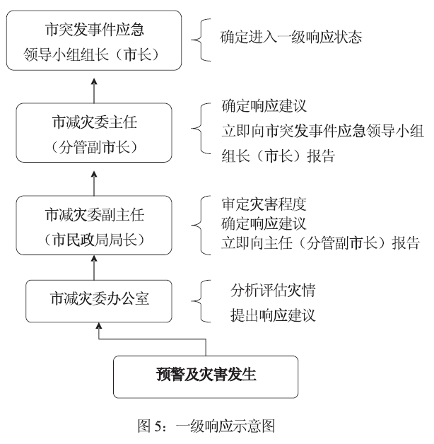市减灾委确认灾害等级达到响应条件后,向市突发事件应急领导小组提出启动一级响应的建议,由市突发事件应急领导小组组长(市长)决定进入一级响应(见图5):