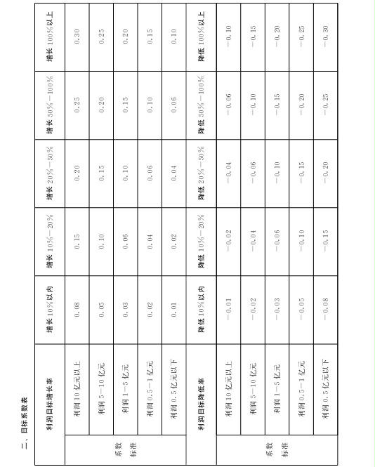 目标系数根据企业利润指标目标值较上年度目标值的增减情况确定,实现考核目标与负责人基薪的联动。企业目标值高于(低于)上年目标值的,按照利润目标规模和增加(下降)比例确定目标系数。目标系数原则上在0~±03范围内。