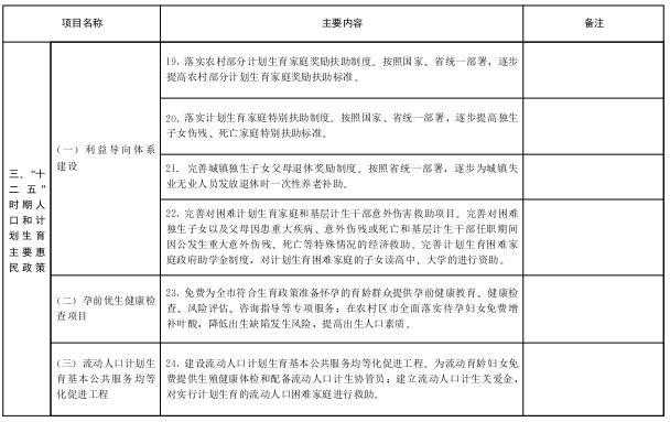 完善计划生育利益导向政策。围绕优生优育、子女成才、抵御风险、生殖健康、家庭致富和养老保障等六个方面,加快建立和完善提高家庭发展能力的政策体系。加大对计划生育家庭的保障力度,在制定最低生活保障、养老、医疗等各项社会保障措施时,给予计划生育家庭一定的奖励和优惠,促进经济社会政策与计划生育政策的有机衔接。落实农村部分计划生育家庭奖励扶助、计划生育家庭特别扶助和独生子女父母奖励等制度,完善独生子女父母退休奖励制度,适时出台新的奖励优惠政策,不断完善农村集体经济内部利益导向制度,引导群众自觉实行计划生育。
