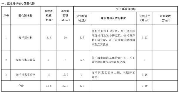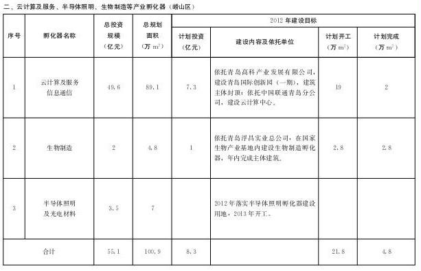 2012年:计划投资8.3亿元,开工建设21.8万平米孵化器,建成4.8万平米。其中,依托青岛高科产业发展有限公司,开工建设青岛国际创新园(一期)17万平米孵化器;依托中国联通青岛分公司,建设云计算中心;依托青岛浮昌实业总公司,在国家生物产业基地内建设生物制造孵化器,年内完成主体建筑。