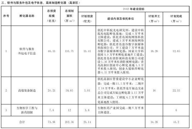 2012年:计划投资23亿元,开工建设34万平米孵化器,建成41万平米。其中,依托中科院光电研究所,建设光电孵化基地,完成4万平米主体建筑;依托青岛润海网络科技有限公司,建成3万平米润海网络孵化器;依托青岛盘谷数字新媒体科技园公司,开工建设7万平米数字新媒体孵化器;依托青岛东唐影视科技有限公司,建设1.36万平米东唐影视孵化器;国家大学科技园9.9万平米孵化基地开工建设;青岛高新区创业中心孵化基地1.3万平米投入使用;创业大厦软件孵化器4.55万平米投入使用。依托青岛高新区管委建设中小企业孵化器,完成一期11.5万平米,二期开工16万平米;依托李沧万福达实业总公司完成万福达孵化器3.15万平米主体建设;工研院6.2万平米孵化基地投入使用。生物医药产业园完成一期6万平米主体建筑。