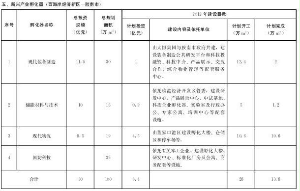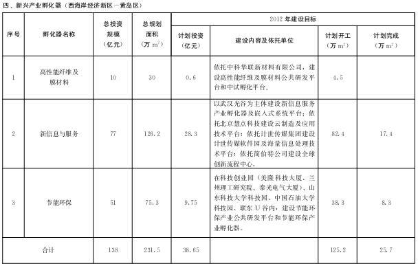 西海岸经济新区重点围绕战略性新兴产业培育和高新技术产业发展,在黄岛区和胶南市共规划建设300万平米专业及综合孵化器。