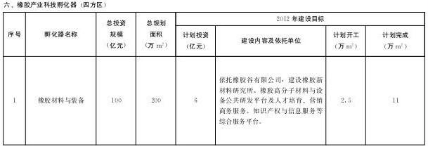 2016年底前,投资100亿元以上,完成橡胶材料与设备等领域共计200万平米以上孵化器及相关配套设施建设。