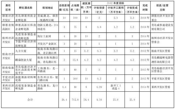 2012年:计划投资9.56亿元,在先进制造、节能环保、新能源新材料、信息技术等领域共开工建设25.9万平米孵化器。其中胶州4万平米、即墨3.5万平米、胶南11.4万平米、平度2万平米、莱西5万平米。