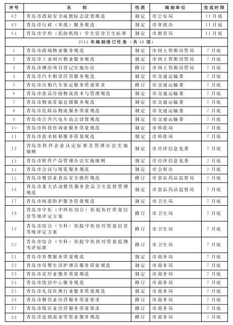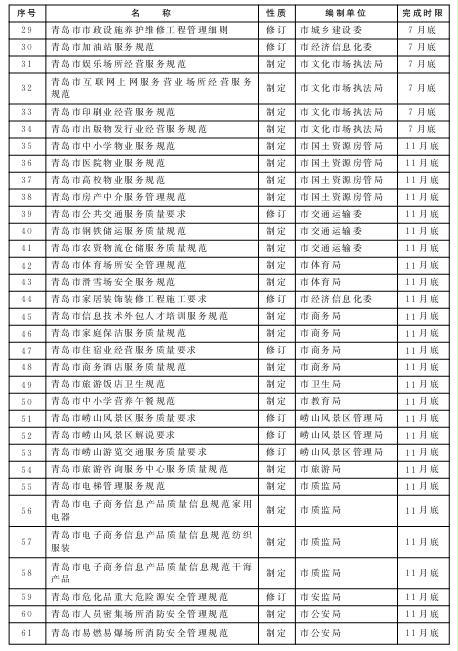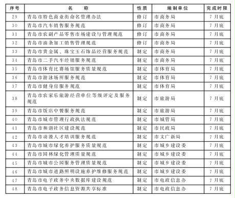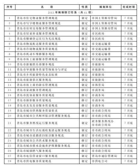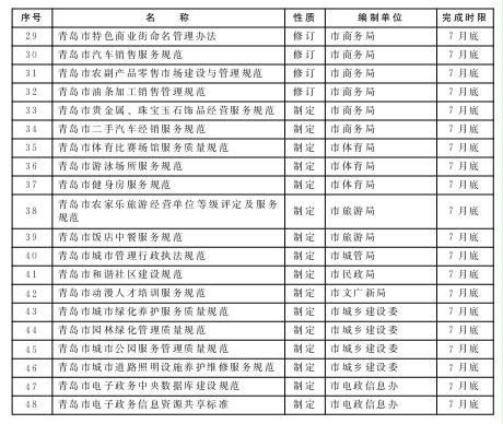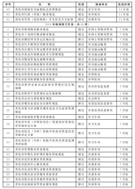 按照先急后缓的原则,每年筛选确定一批群众反映较为突出、服务标准急需规范的行业,组织开展标准规范编制工作;梳理检查标准规范实施情况,对已过有效期限的行业标准规范及时清理和修订完善,对正在实施的标准规范明确牵头责任部门,落实责任目标,做好标准规范的实施监督,提升行业服务水平。力争用1年左右的时间,编制或修订服务业标准规范112项,使标准规范覆盖我市服务业主要行业,形成具有青岛特色的服务业标准规范体系。